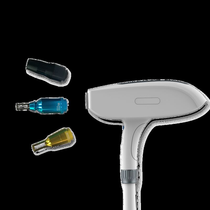 Laser có hai đầu điều trị có thể thay thế, mỗi đầu cung cấp bước sóng khác nhau: 1064 nm & 532 nm.